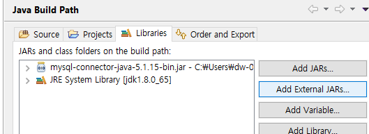 Build Path에서 mysql connector와 연결을 해야 DB연동이 되지!