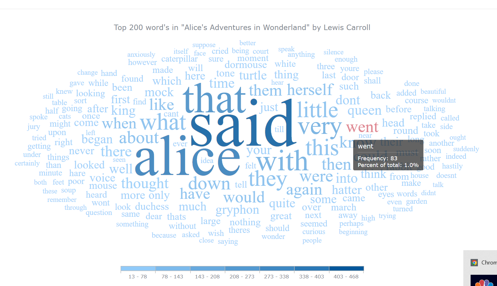 'Top 200 word\'s in "Alice\'s Adventures in Wonderland" by Lewis Carroll'
