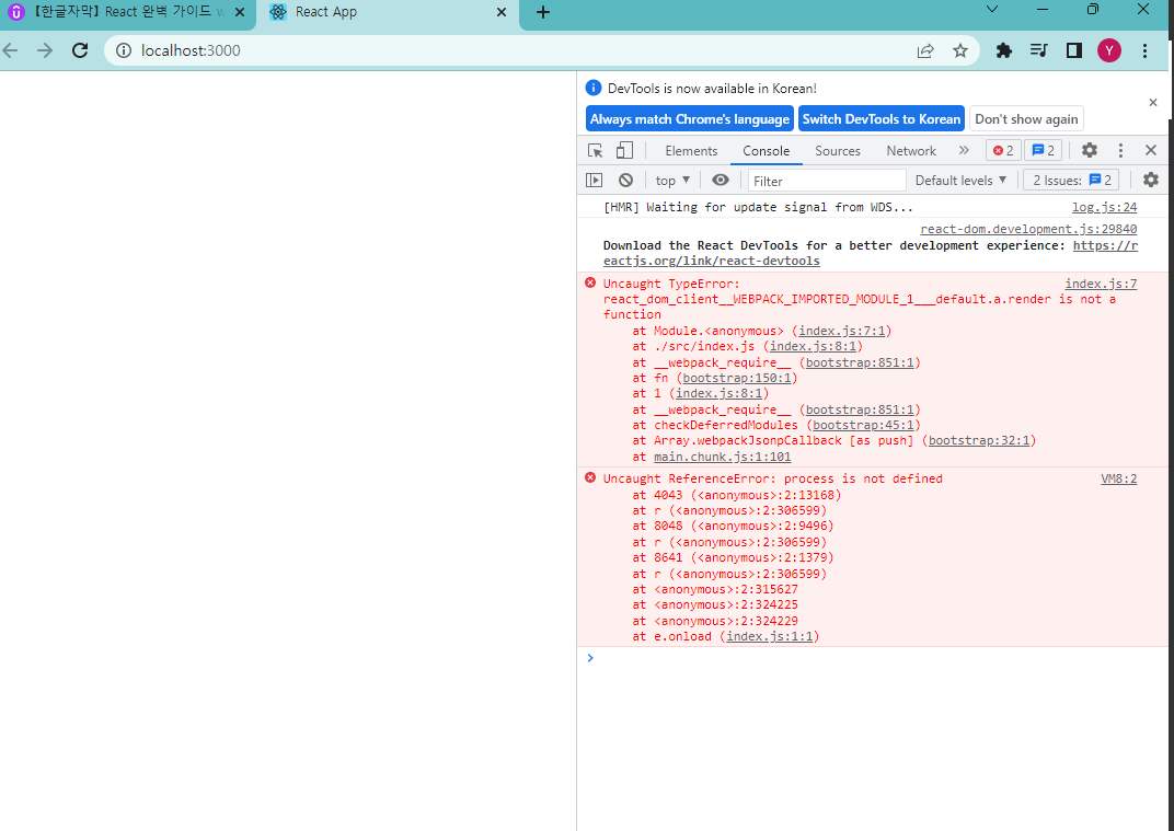 npm start해서 서버를 돌리는데 빈 화면이 뜨는 것이었다. 그래서 콘솔을 확인해보니 다음과 같은 오류가 떴다.