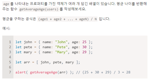 console.log( getAverageAge(arr) ); // (25 + 30 + 29) / 3 = 28