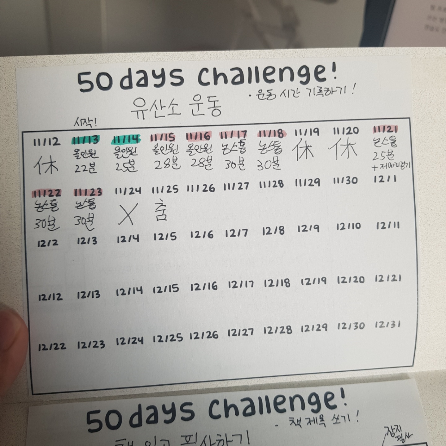 그래서 나는 이번에 50일 챌린지(사실상 49일 챌린지)를 시작하기로 했다. 이 챌린지를 통해 유산소 운동과 독서&필사가 습관으로 잘 자리잡히면 좋겠다.