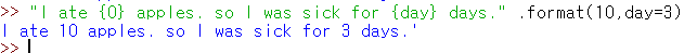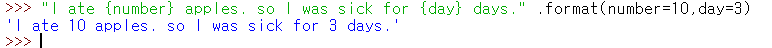 {name} 형태를 사용할 경우 format 함수에는 반드시 name=value와 같은 형태의 입력값이 있어야만 한다.