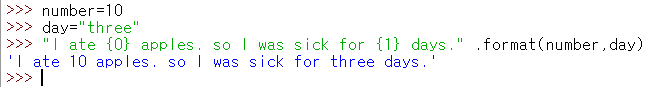 2. 2개 이상의 값을 넣을 경우 문자열의 {0}, {1}과 같은 인덱스 항목이 format 함수의 입력값으로 순서에 맞게 바뀐다.