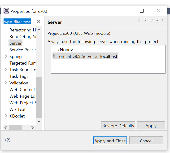 3. "Always use the following server when running this project" 목록에서 Tomcat v8.5 Server at localhost를 선택해주고 Apply and Close를 누르자. 이러면 해결!